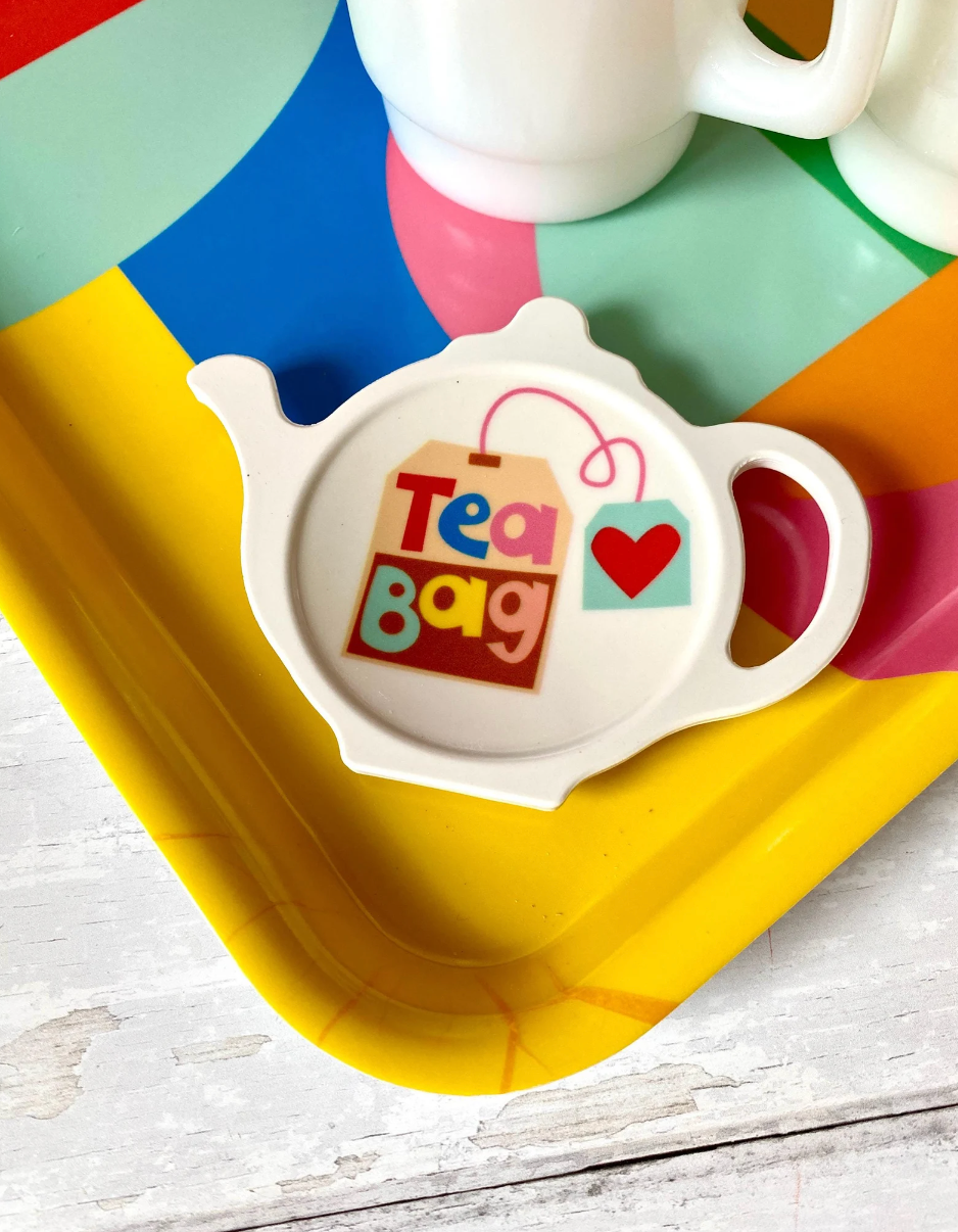 This fun glossy melamine tea bag tidy measures 12 x 9.5cm. It is designed by Carla from Poppekins and made in the UK by a family run business.